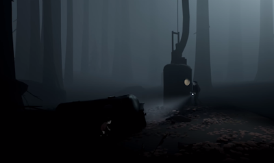 The boy jumps down from some rocks and enters a dark forest. He comes across a fallen tree lying across a chasm and carefully balances across it. Further down the path he comes to a blockage with barbed wire and climbs through it. In the distance a truck can be seen and as the boy comes closer he starts sneaking. It is clear that the boy doesn't want to get spotted. Inside the truck he gets a quick glimpse of some weird figures, but before he can make out what they are a man shuts the door and the truck drives off.