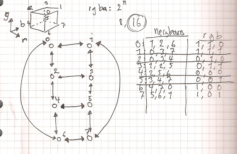 The plain-vanilla way to do is, is to have an alpha texture for each texture layer and then draw one texture layer after another. Instead of having many render passes, I wanted to do as much blending in a single draw call. By using a an RGBA texture for the alpha I could do a maximum of 4 at the same time. I first considered this, but then I saw a paper by Martin Mittring from Crytek called "Advanced virtual texture topics" where an interesting approach was suggested. By using an RGB texture up to 8 textures could be blended, by letting each corner of an rbg-cube be a texture. A problem with this approach is that each texture can only be nicely blended with 3 other corners (textures), restricting artists a bit. See below how texture layers are connected (a quick sketch by me):
