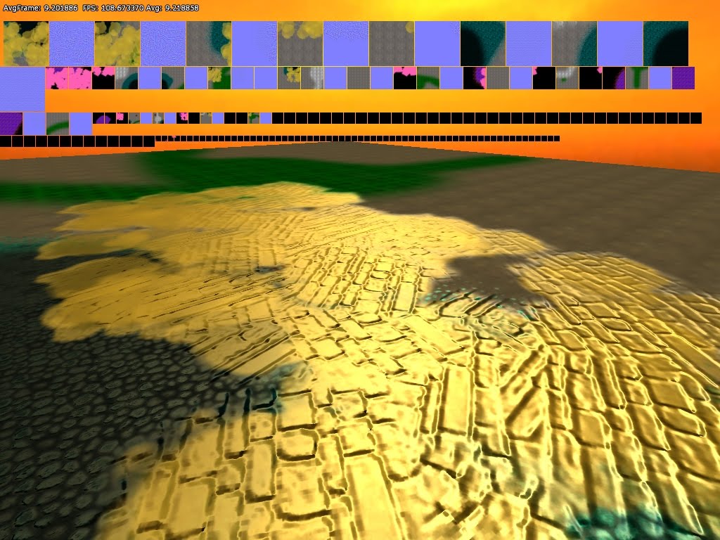 However, I got into a few problems with this approach, that I first thought where graphics card problems, but later turned out to be my fault. During this I switch to using several layers of RGBA textures instead, blending 4 textures at each pass. When I discovered that is was my own error (doh!), I had already decided on using cache textures (more on that in a jiffy), which put less focus on render speed of the blending. Also this approach seemed nicer for artists. So I decided on a pretty much plain-vanilla approach, meaning some work in vain, but perhaps I can have use for it later on instead.
