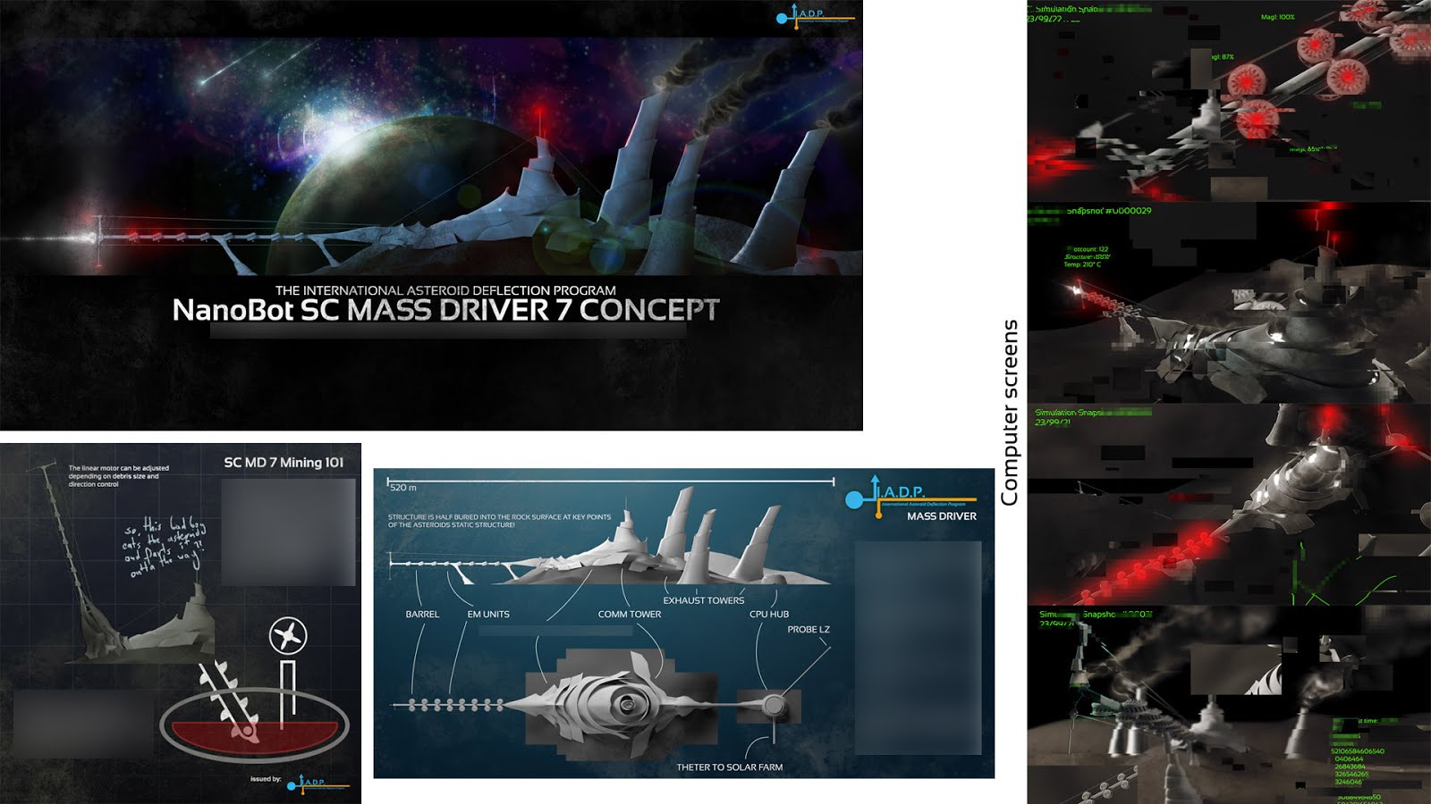 Now here's something from our Alpha/Vertical Slice. Instead of the Ark being a supercomputer shot into the emptiness of space, it was actually meant to carry some "uncorrupted" WAU to the asteroid. There the WAU would grow a mass driver engine and push it out of the way. This didn't fit well with our central themes so we removed it.